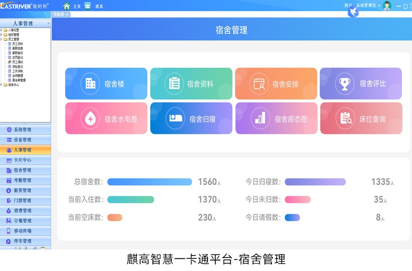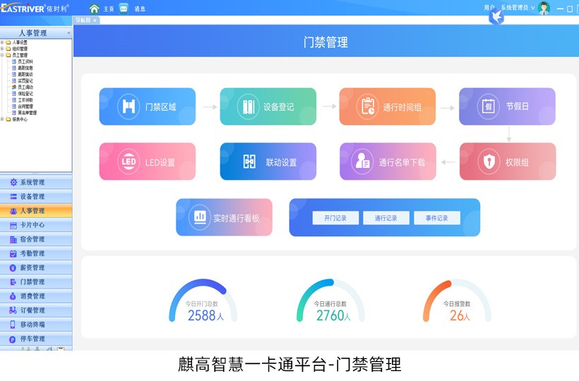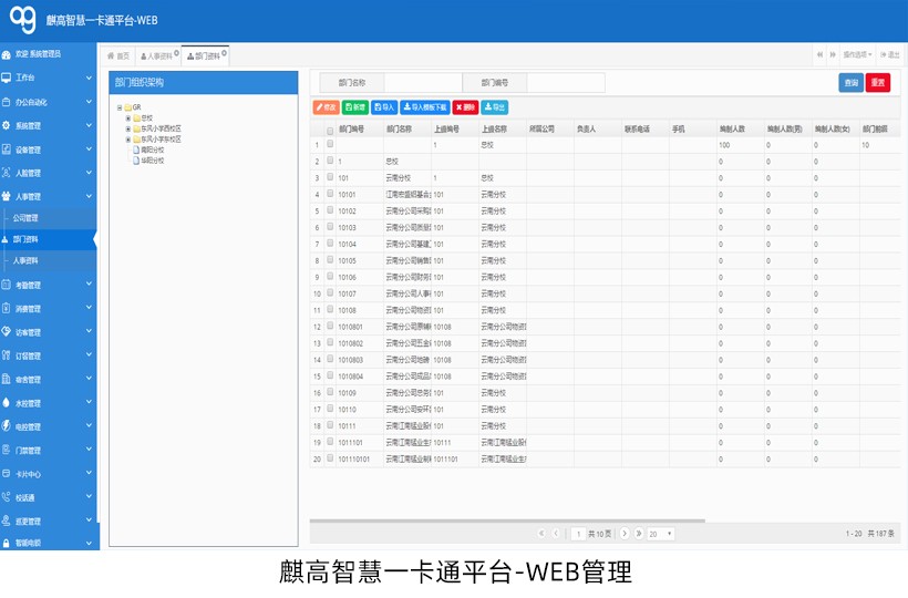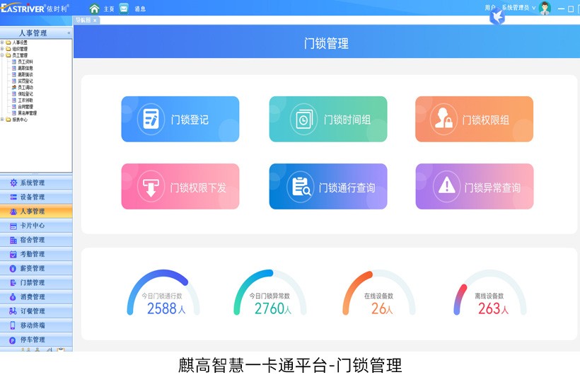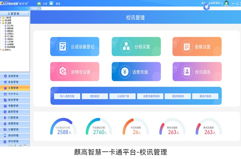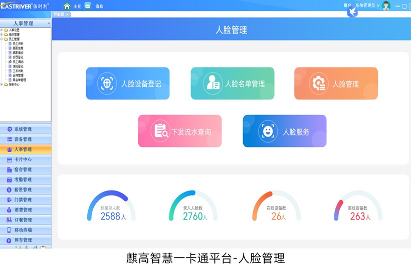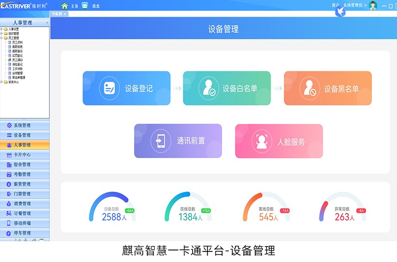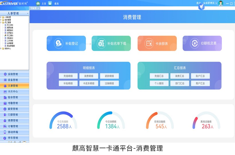 依时利《麒高智慧一卡通平台》为打造信息化提供一种快速、便捷、有效的管理手段。平台利用成熟的云计算机技术、互联网技术、通信技术,物联网技术、人脸技术、二维码技术将使用单位的众多后勤管理工作通过M1卡、CPU卡、NFC手机、二维码、人脸特征、生物识别等手段连接成为一个有机的综合体。基于CS/BS稳定架构开发,通过三层架构设计,平台支持云服务器部署,应用集团公司、多园区管理、跨国集团、多子公司的管理模式,为平台提供60个以上管理模块服务,模板应用子系统包括:人脸采集系统、宿舍管理系统、停车缴费系统、中间件接口系统、银行接口系统、人脸管理系统、考勤管理系统、电梯管理系统、门禁管理系统、消费管理系统、订餐管理系统、加密管理系统、卡务管理系统、通道管理系统、LED发布管理系统、行为分析系统、水控管理系统、电控管理系统、停车管理系统、无线门锁系统、微信访客系统、人证管理系统、自助机管理系统、校讯管理系统、班牌管理系统、信息发布系统、校讯定位系统、视觉餐台系统、薪资管理系统、人事管理系统、终端管理系统、数据分析系统、称重管理系统、会议预约系统、健康管理系统、指纹管理系统、充电桩管理系统、新能源充电系统、报修管理系统、巡更管理系统、彩屏发布管理系统、缴费管理系统、球场预约系统、车位引导系统、培训管理系统、绩效管理系统、晚归推送系统、洗衣控制系统、饮水控制系统、远程抄表系统、收银结算系统、自助保温取餐系统、外卖订餐系统、车辆接送系统、联动报警系统、WEB查询系统、工衣领取系统、车辆定位系统、人员定位系统、图书管理系统等。