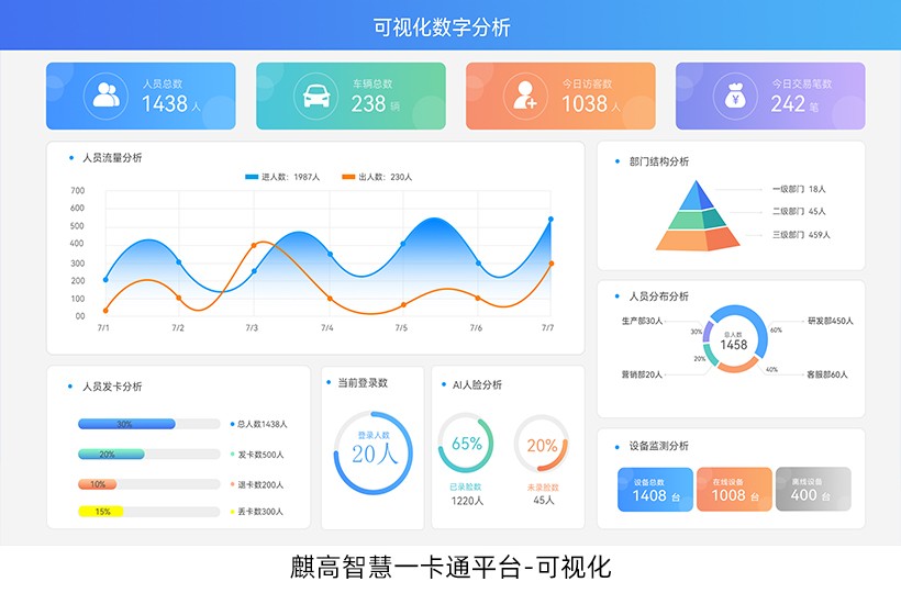 随着信息技术的影响深度和广度正在迅猛的不断加大,社会大环境决定着智慧综合卡码脸物联管理平台建设也需要依托互联网技术以及通讯技术来全面完成信息化建设,打通管理壁垒,实现一流新型现代化管理模式。现代化管理的目标就是要提高管理效率,降低管理成本,营造信息化的管理氛围。平台广泛用于园区、企业、学校、医院、政府、工厂、集团等场景,平台采用组合结构可按需要自由选择对应的功能应用模块。