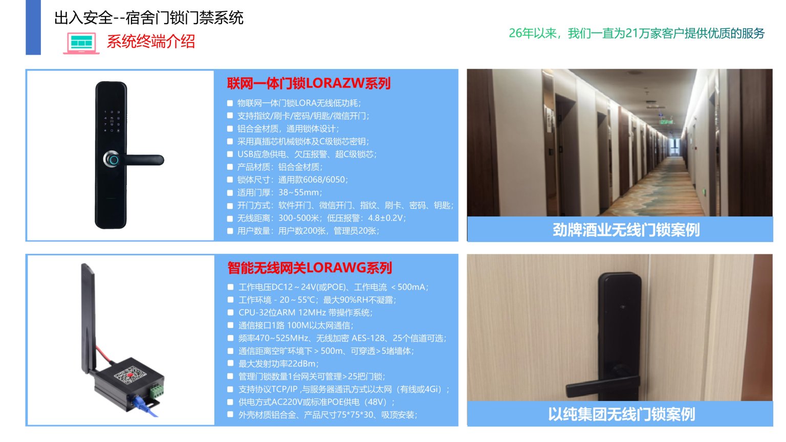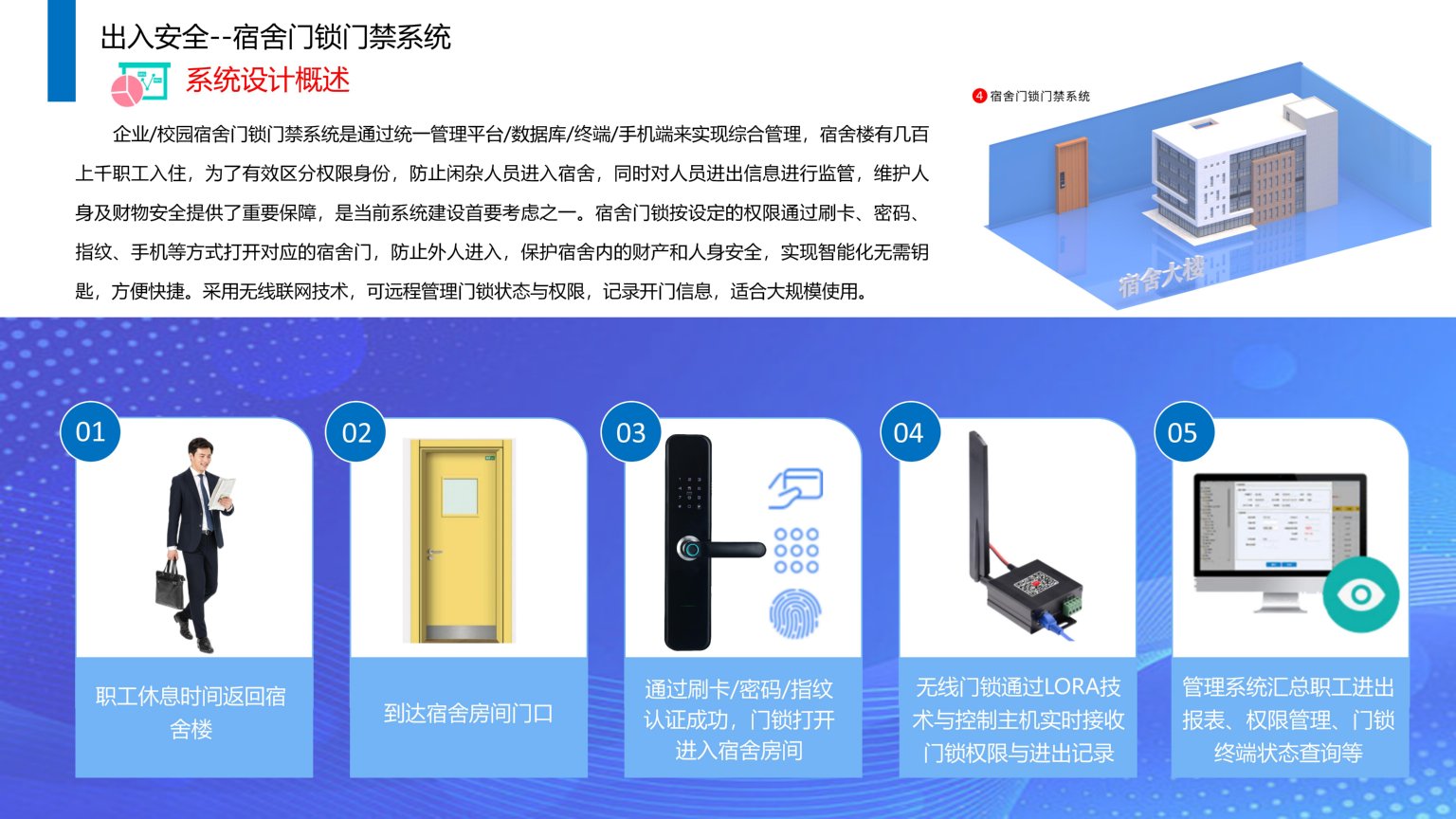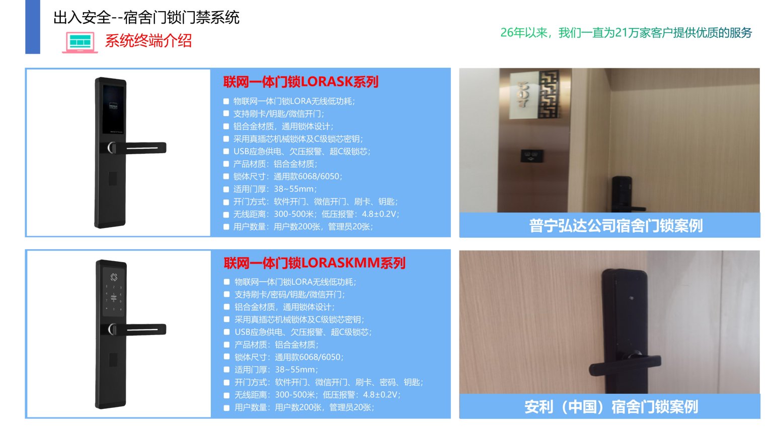 依时利企业/校园宿舍门锁门禁系统是通过统一管理平台/数据库/终端/手机端来实现综合管理,宿舍楼有几百上千职工入住,为了有效区分权限身份,防止闲杂人员进入宿舍,同时对人员进出信息进行监管,维护人身及财物安全提供了重要保障,是当前系统建设首要考虑之一。宿舍门锁按设定的权限通过刷卡、密码、指纹、手机等方式打开对应的宿舍门,防止外人进入,保护宿舍内的财产和人身安全,实现智能化无需钥匙,方便快捷。采用无线联网技术,可远程管理门锁状态与权限,记录开门信息,适合大规模使用。