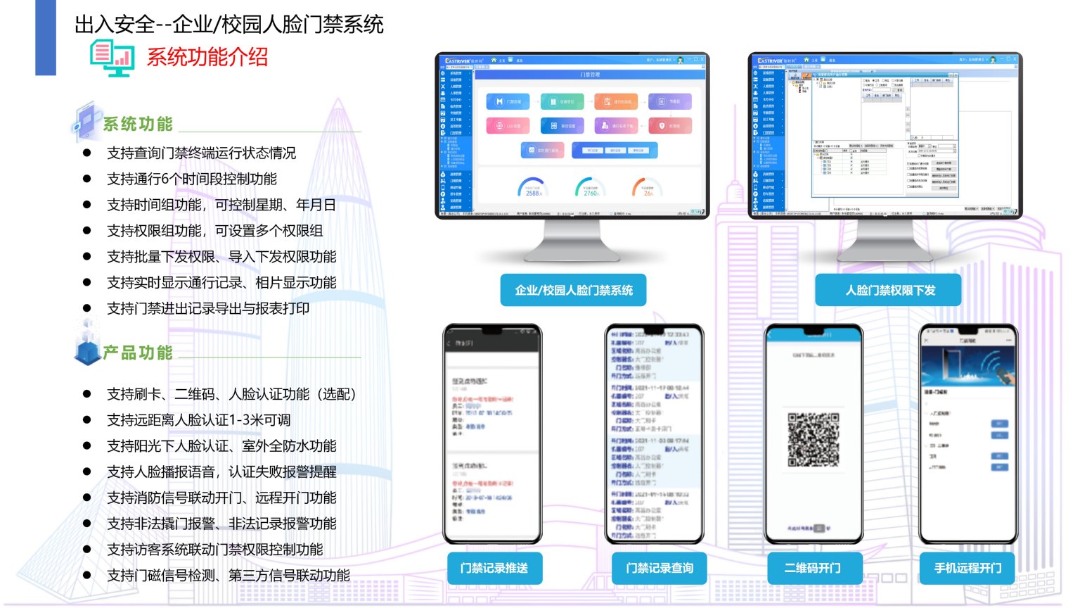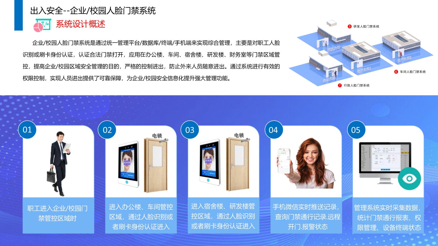 依时利企业/校园人脸门禁系统是通过统一管理平台/数据库/终端/手机端来实现综合管理,主要是对职工人脸识别或刷卡身份认证,认证合法门禁打开,应用在办公楼、车间、宿舍楼、研发楼、财务室等门禁区域管控,提高企业/校园区域安全管理的目的,严格的控制进出,防止外来人员随意进出。通过系统进行有效的权限控制,实现人员进出提供了可靠保障,为企业/校园安全信息化提升强大管理功能。