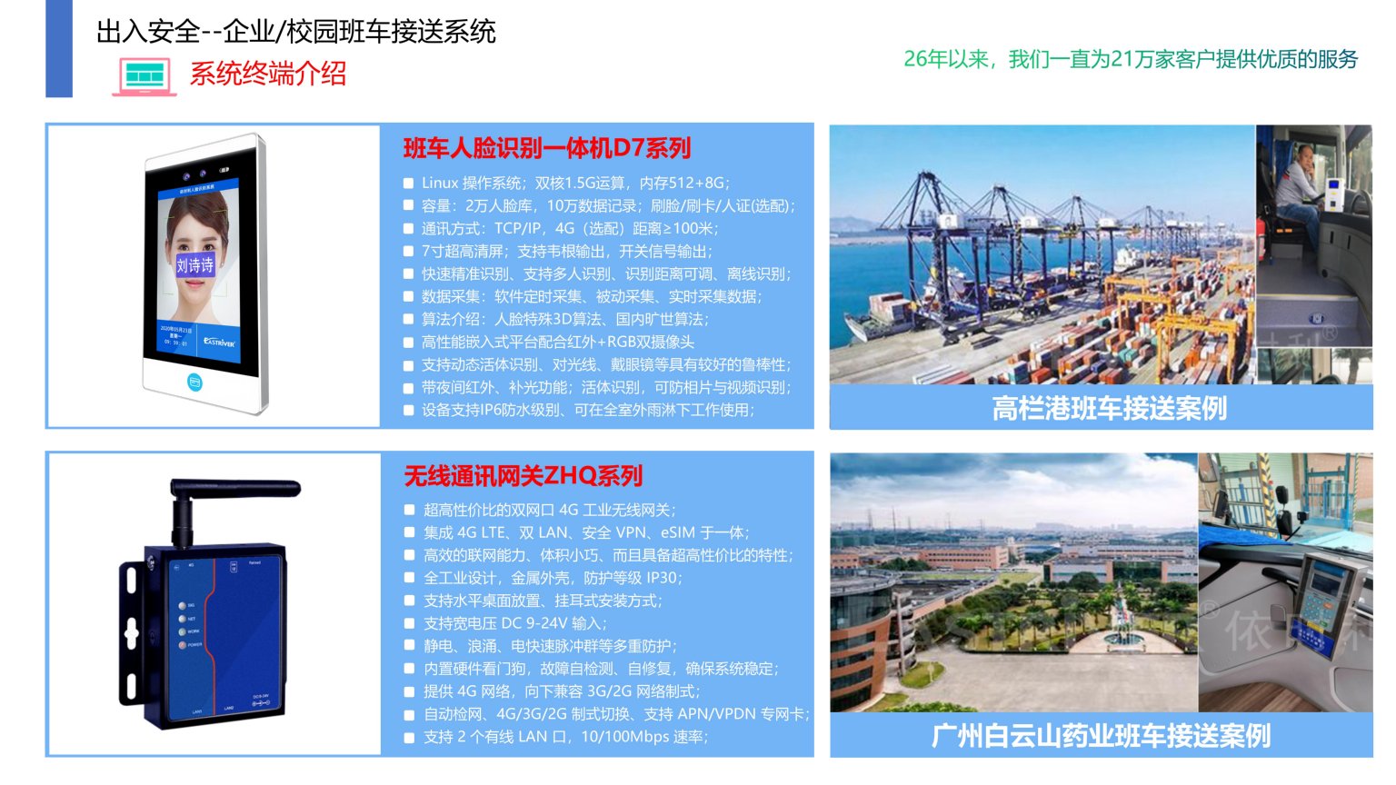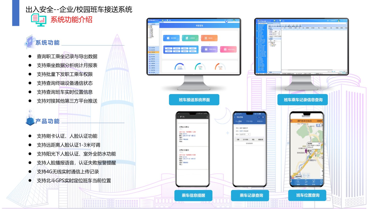 依时利企业/校园班车接送系统是通过统一管理平台/数据库/终端/手机端来实现综合管理,利用GPS定位技术和刷脸识别机实现班车管理和接送的系统。GPS定位器实时监控班车的位置、速度、路线等信息,以及通过刷脸识别机记录职工的上下班时间、地点等信息。通过微信实时推送通知职工和企业/校园班车的动态,以及提供多重报警功能,如超速报警、线路异常报警等,以保证班车的安全运行和职工的人身安全,提高企业/校园班车服务的质量和效率。