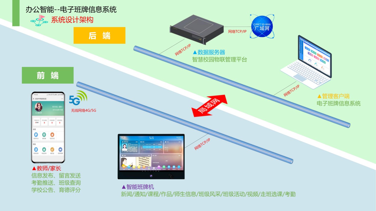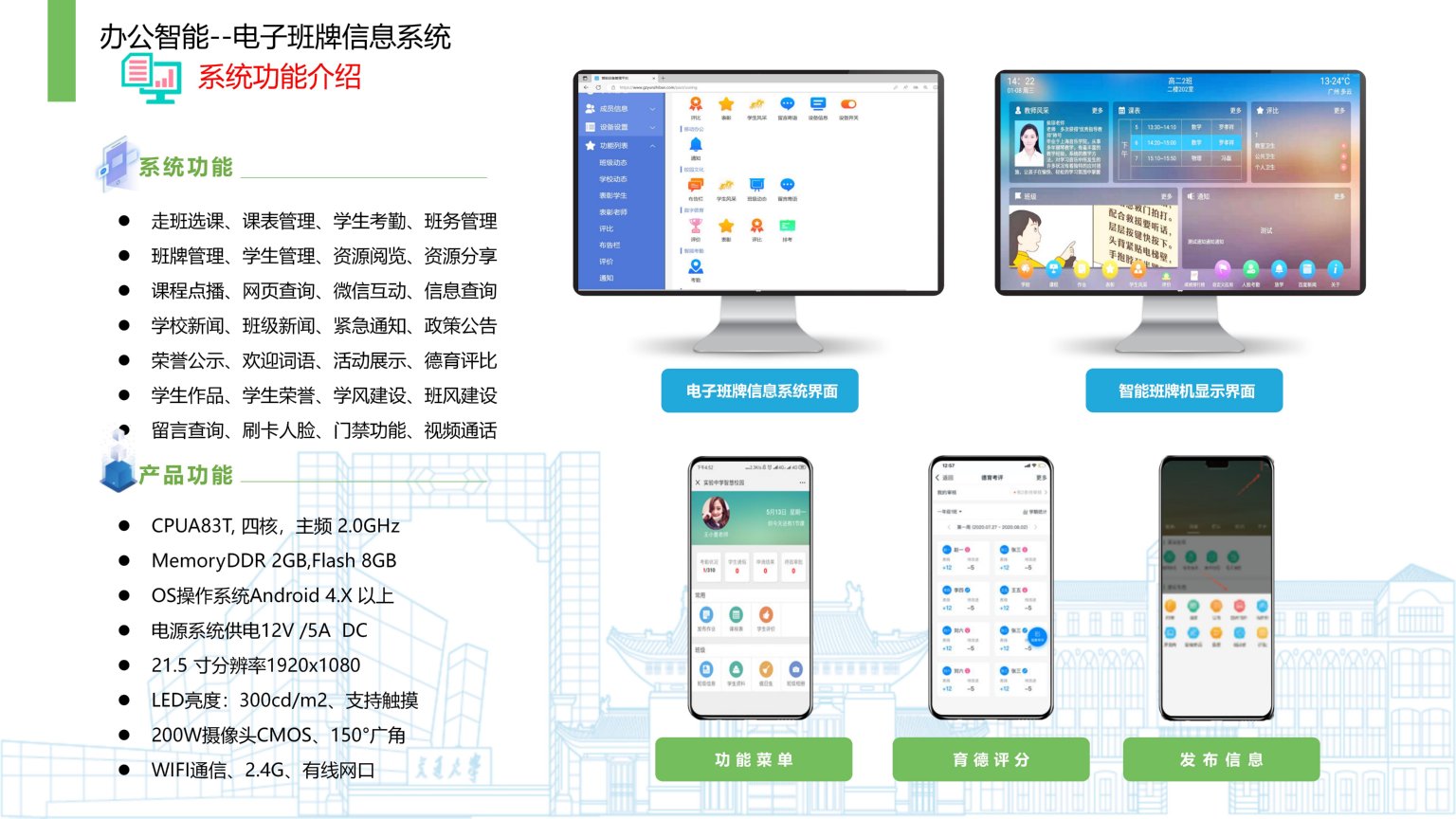 依时利校园电子班牌信息系统是通过统一管理平台/数据库/终端/手机端来实现综合管理,校园多媒体综合管理平台为核心,以智慧班牌及信息宣传屏为展示窗口,在信息发布的技术基础上,融合了教务业务管理工具。在班级门口的显示终端上展示各种信息,如学校新闻、教学内容、考勤情况、家校互动等。可以提高学校的形象和教育质量,展示学校的特色和风采。方便老师和学生的教学管理和办公,提供便捷的工具和平台。家校之间的沟通和交流,让家长了解孩子的成长情况,实现信息的实时更新和共享。