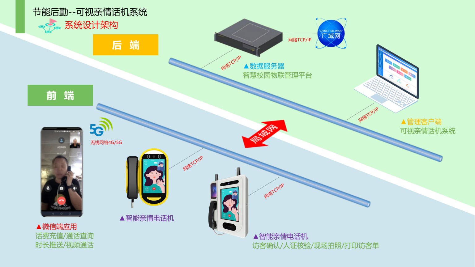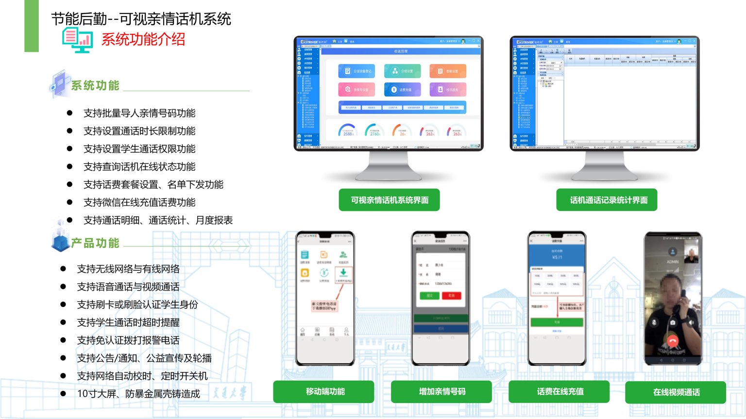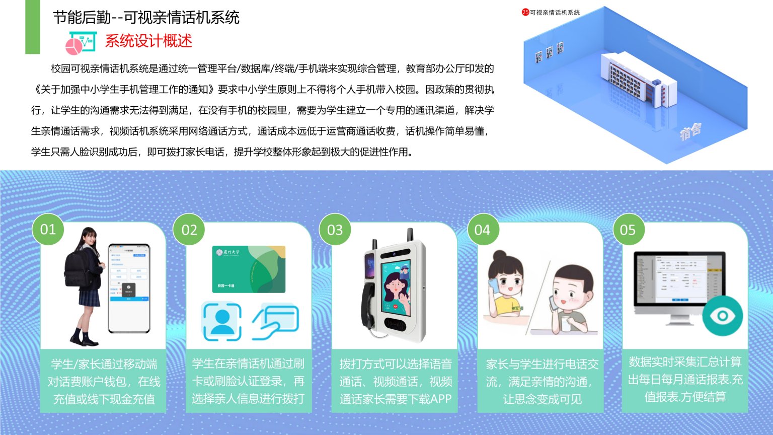 依时利校园可视亲情话机系统是通过统一管理平台/数据库/终端/手机端来实现综合管理,教育部办公厅印发的《关于加强中小学生手机管理工作的通知》要求中小学生原则上不得将个人手机带入校园。因政策的贯彻执行,让学生的沟通需求无法得到满足,在没有手机的校园里,需要为学生建立一个专用的通讯渠道,解决学生亲情通话需求,视频话机系统采用网络通话方式,通话成本远低于运营商通话收费,话机操作简单易懂,学生只需人脸识别成功后,即可拨打家长电话,提升学校整体形象起到极大的促进性作用。