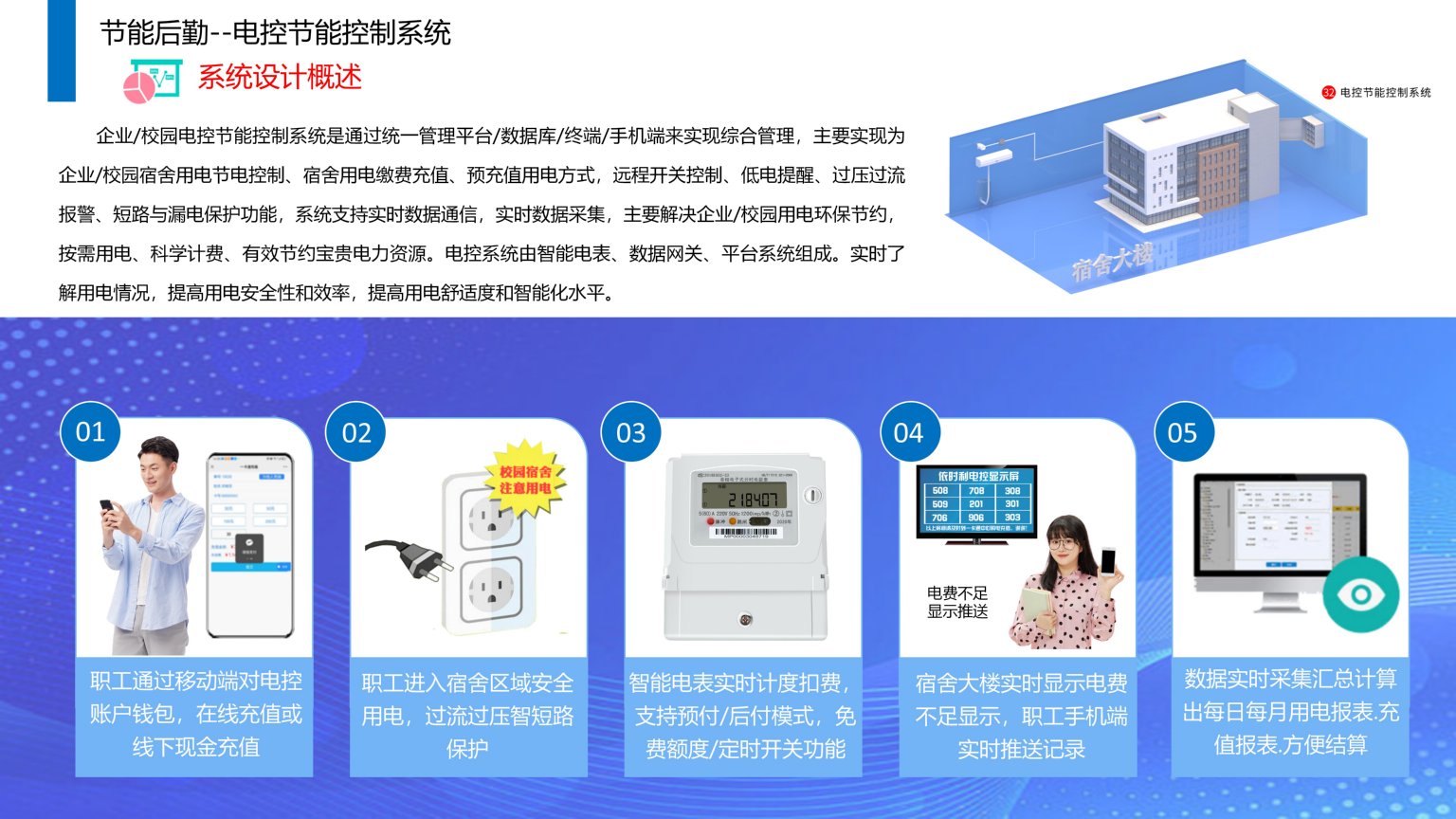 依时利企业/校园电控节能控制系统是通过统一管理平台/数据库/终端/手机端来实现综合管理,主要实现为企业/校园宿舍用电节电控制、宿舍用电缴费充值、预充值用电方式,远程开关控制、低电提醒、过压过流报警、短路与漏电保护功能,系统支持实时数据通信,实时数据采集,主要解决企业/校园用电环保节约,按需用电、科学计费、有效节约宝贵电力资源。电控系统由智能电表、数据网关、平台系统组成。实时了解用电情况,提高用电安全性和效率,提高用电舒适度和智能化水平。