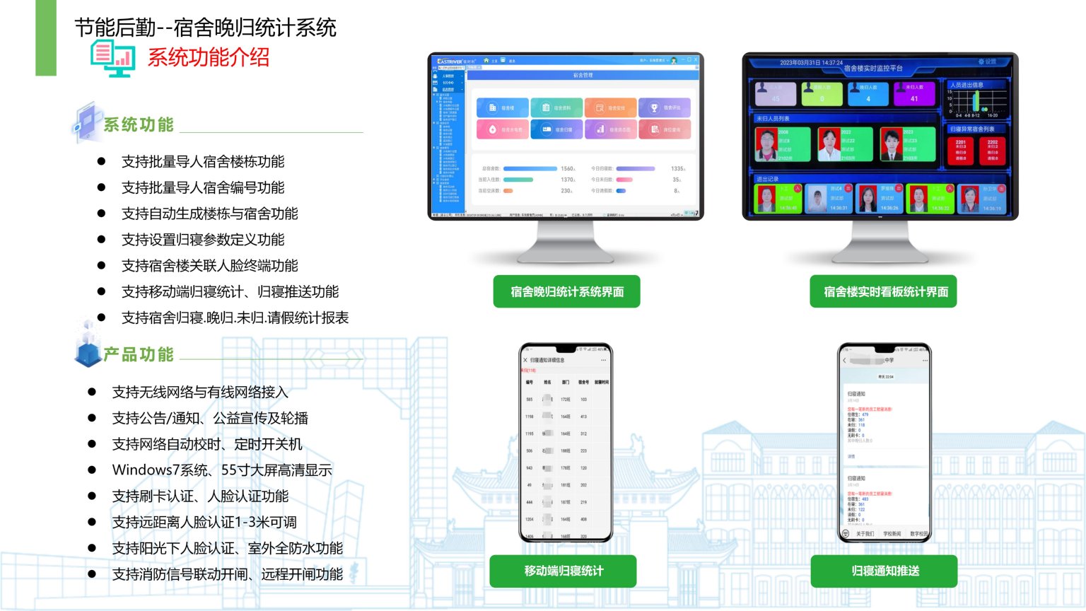 依时利校园宿舍晚归统计系统是通过统一管理平台/数据库/终端/手机端来实现综合管理,当前宿舍还采用传统人工方式对学生的归寝需耗费大量人工进行核查归寝、统计,造成数据不准确、人员浪费、效率较低等情况。部分学校对学生住宿归寝不闻不问,发生事故情况很难快速采取措施,不能将危害降到最小。针对以上情况需通过本系统实现学生出入宿舍自动记录数据、通行管理、在寝人数分析并形成归寝数据统计,请假情况统计、晚归数据推送等,方便学校数字化管理。