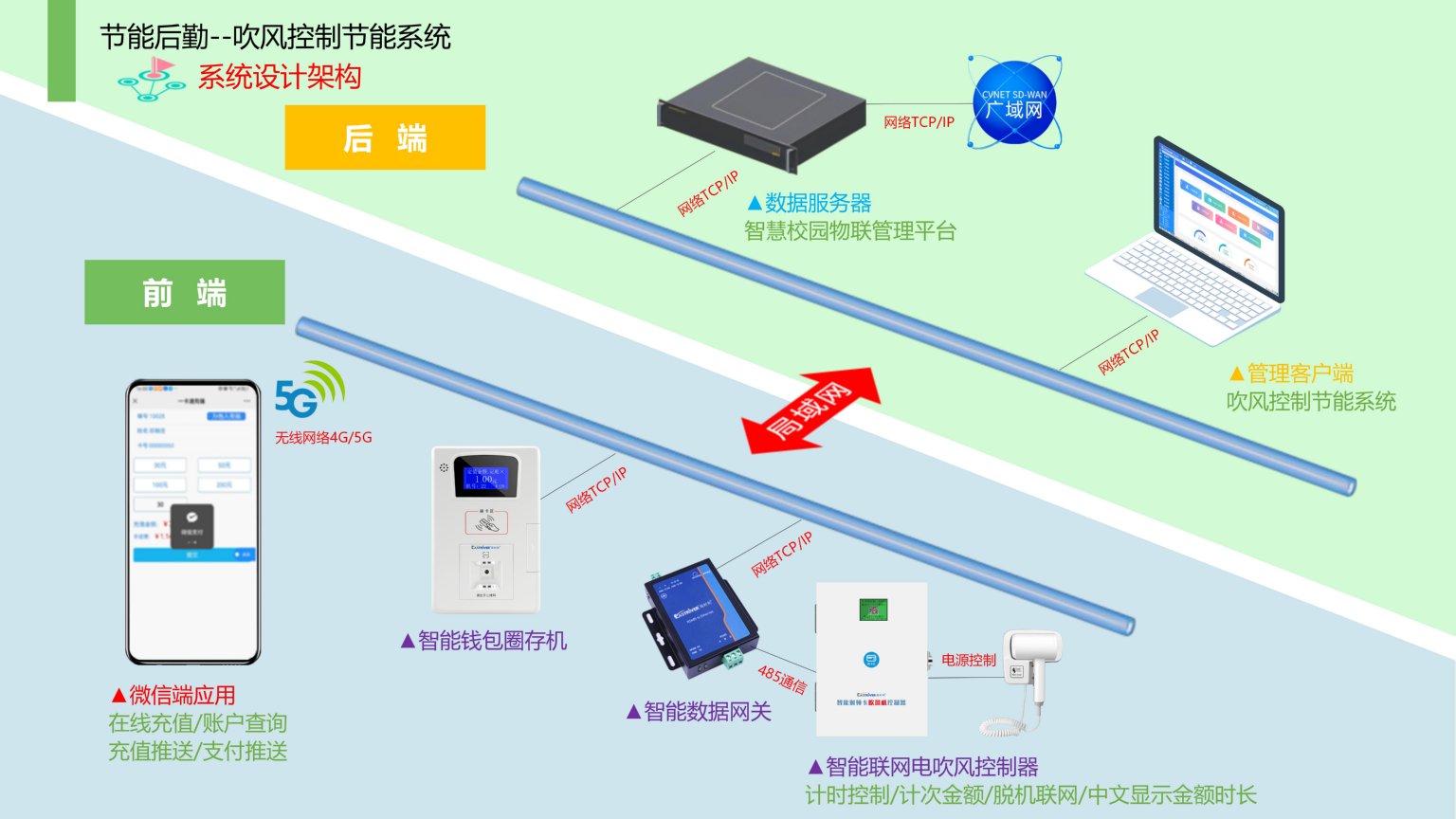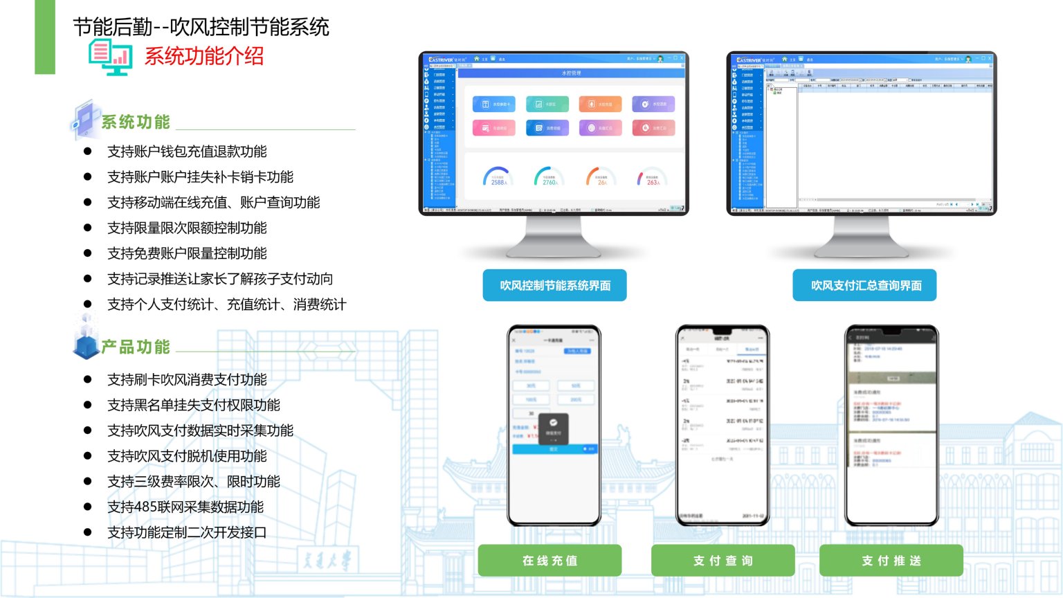 依时利校园吹风控制节能系统是通过统一管理平台/数据库/终端/手机端来实现综合管理,吹风控制消费系统是一种利用电吹风的工作时间来计算消费金额的系统。通过设置不同的时间与金额来调节电吹风的工作时长,以满足用户的不同需求。该系统还可以通过显示屏来显示消费信息,如剩余时间、已消费金额等,方便学生了解自己的消费情况,该系统可应用于宿舍、浴室、公共澡堂等场所,节约能源,提高效率,增加收入。